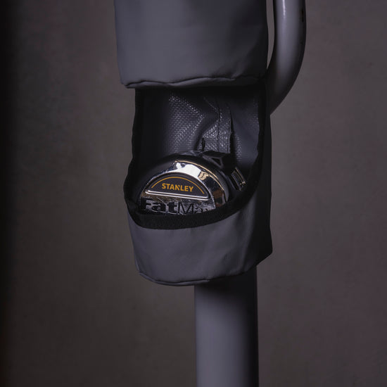 - Anti-slip rubber lined ROPS straps with 30-80mm diameter adjustment - 80mm diameter drink holder with adjusting cord lock - Foil insulated - 80mm opening for tape measure/ keys + 50mm deep bucket - 4 x texta/ pencil slots - 490 GSM PVC ripstop tarpaulin
