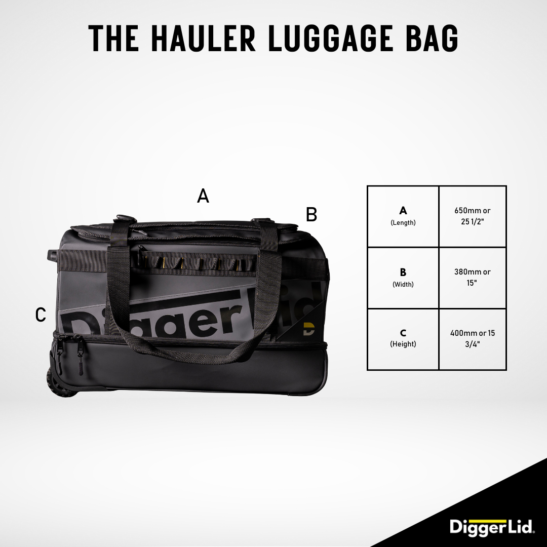 - 60L Capacity - 6.4kg Weight - Dirty Boot Draw String Bag - Separate shoe compartment - Quick access Laptop sleeve - DiggerLid branded YKK Zippers - 2 x Exterior YKK buckles for additional luggage security - 2 x Large XXX strap handles with Velcro carry handle - 7 x Loop Points on each side of bag (14 in total) - 2 external accessible secret compartments for personal items - Main compartment has 2 mesh zip bags inside lid - Secondary compartment to keep your dirty work clothes away from your clean clothes - PVC Luggage Identity tag sleeve - Rugged all terrain wheels - Extendable handle for easy wheeling - Hard shell internal structure